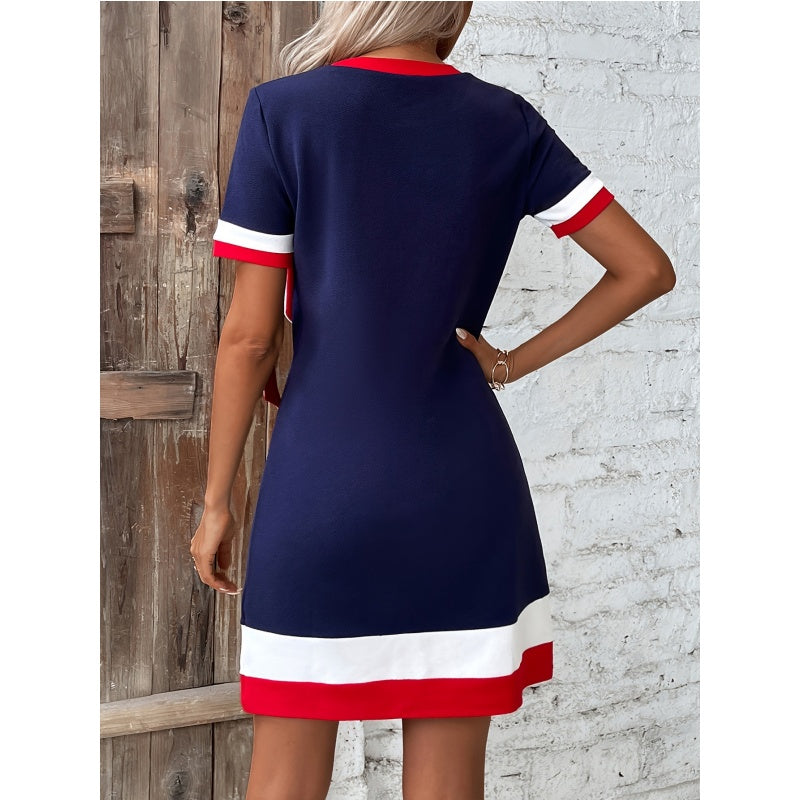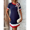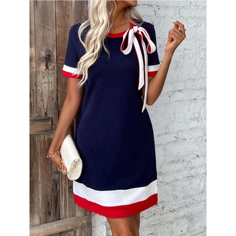 STILIG BLOKKMØNSTER: Denne fantastiske kjolen har et sofistikert marineblokkmønster som kombinerer dristige fargetoner og skaper et flatterende, moderne utseende som passer perfekt til enhver anledning.