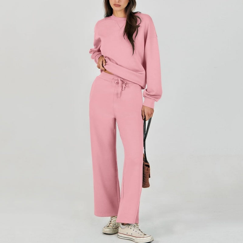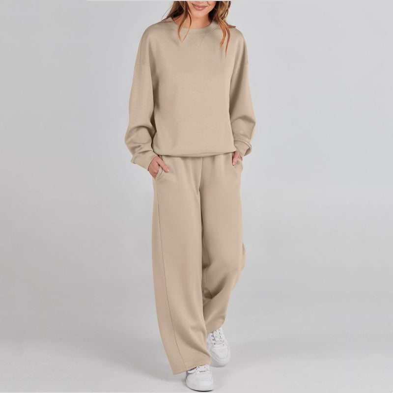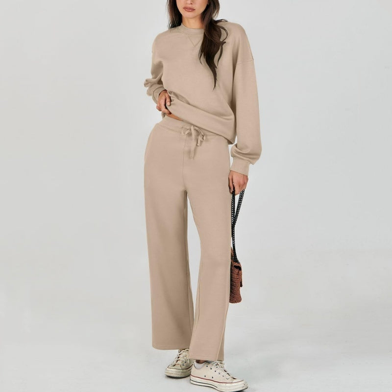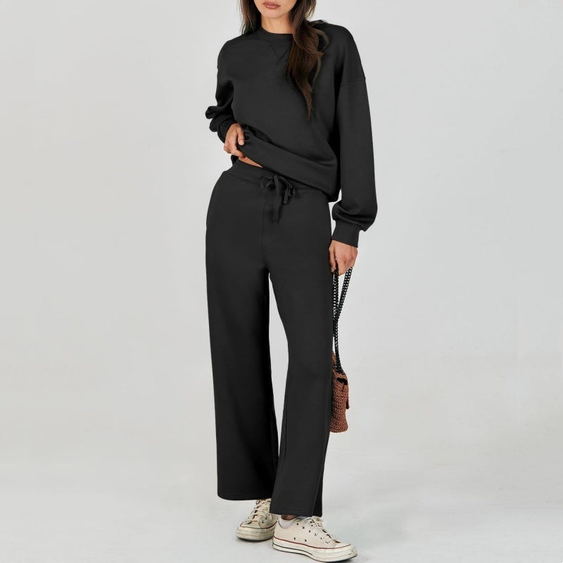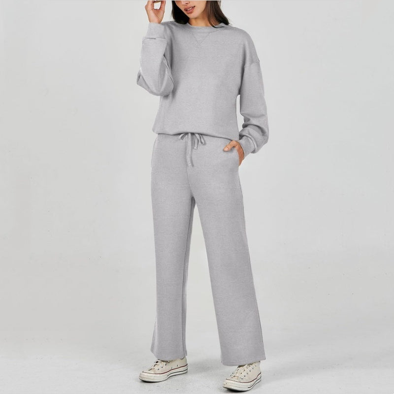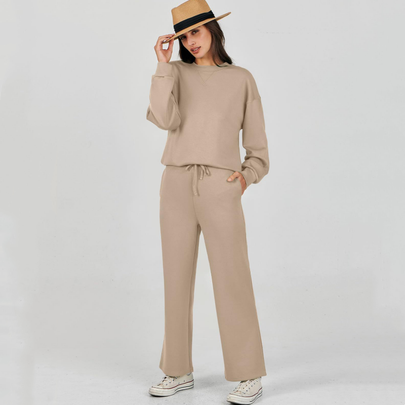 STILFULL OG KOMFORTABEL DESIGN – Dette todelte treningssettet for damer kombinerer avslappet komfort med raffinert stil. Settet består av en langermet genser med avslappet passform og flytende, vide bukser som gir en flatterende silhuett.