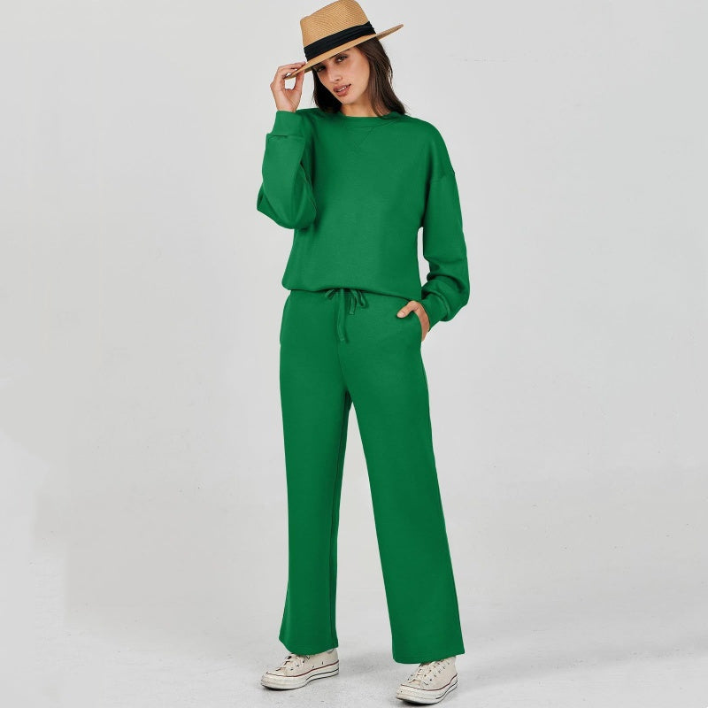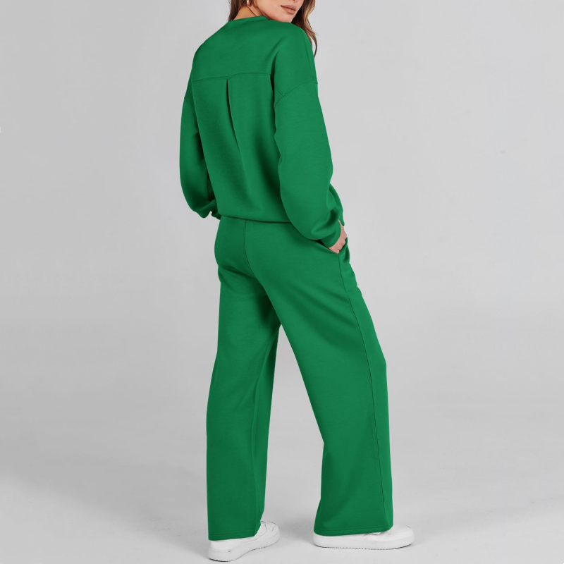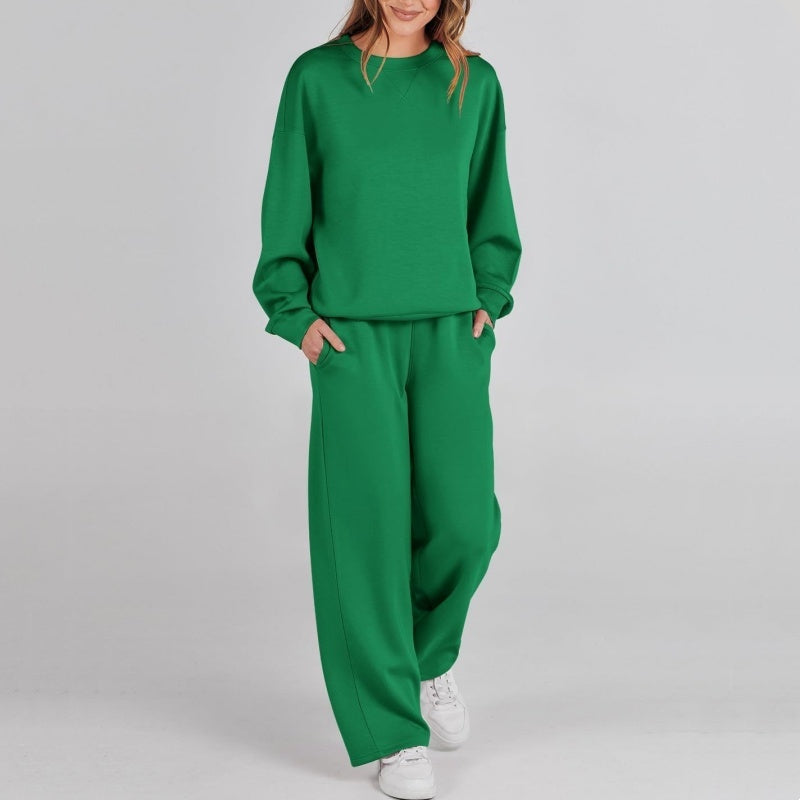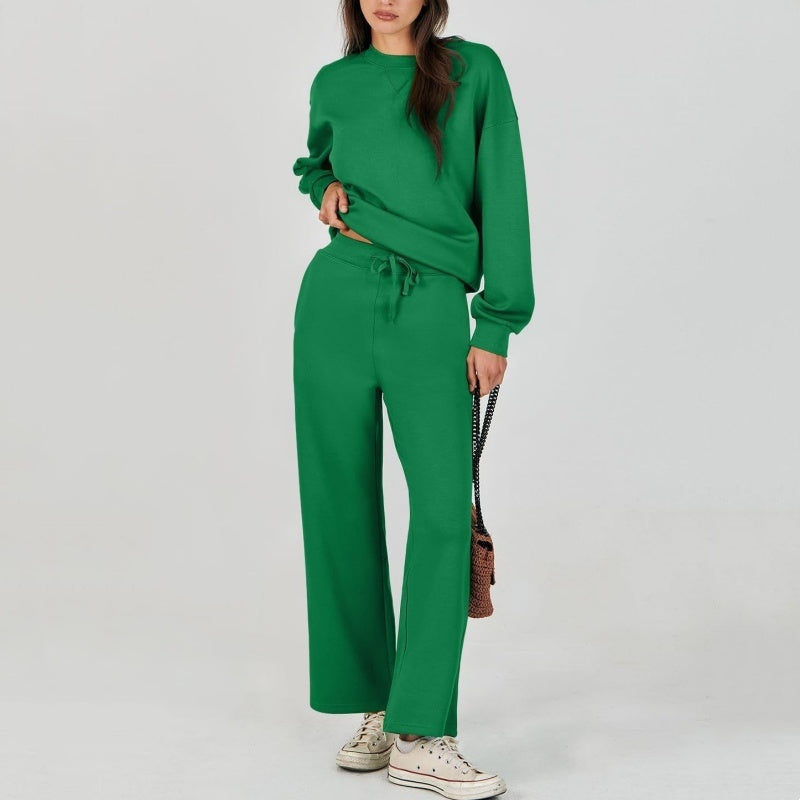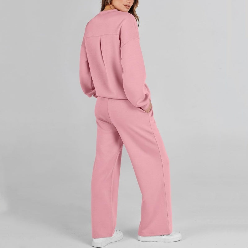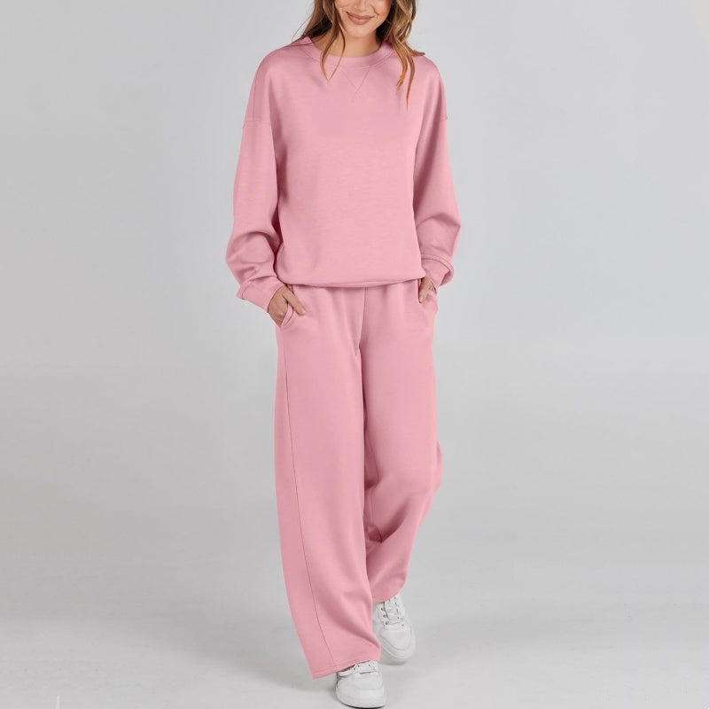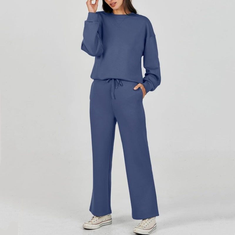 STILFULL OG KOMFORTABEL DESIGN – Dette todelte treningssettet for damer kombinerer avslappet komfort med raffinert stil. Settet består av en langermet genser med avslappet passform og flytende, vide bukser som gir en flatterende silhuett.