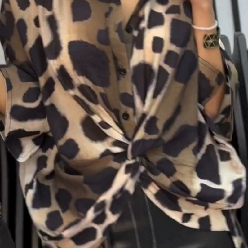 Skjorte med revers og leopardmønster, løs skjorte med syv ermer