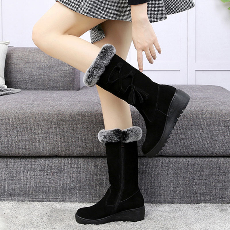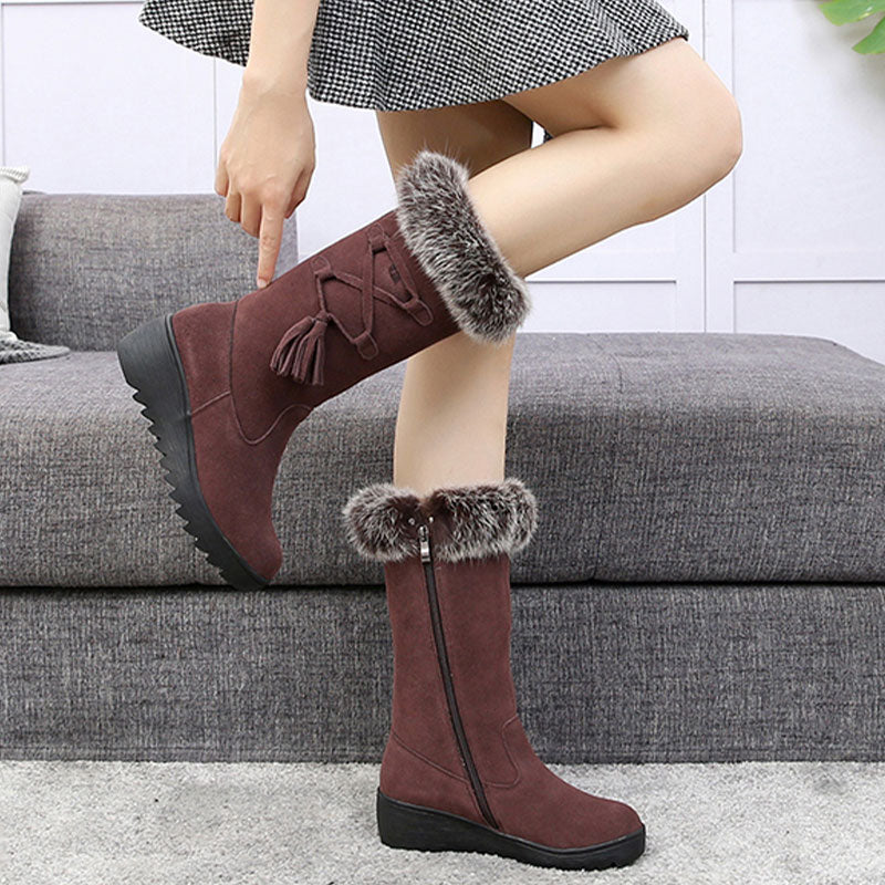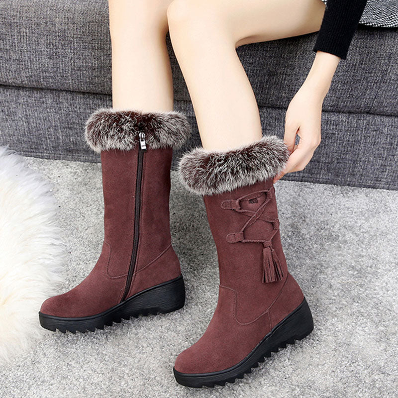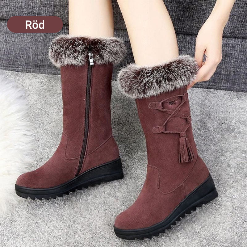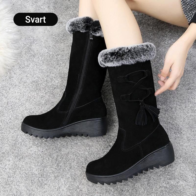 VARME: Disse støvlene er fôret med myk fuskepels som hindrer snø og vind i å trenge inn, samtidig som de holder på varmen. Det myke designet rundt toppen gir et elegant og lekent preg til looken din.