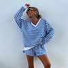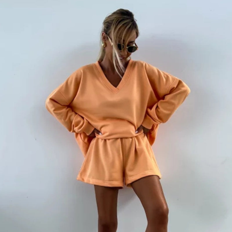 Casual sett for kvinner med V-hals, langermet topp og shorts med strikk i midjen, 2-delt