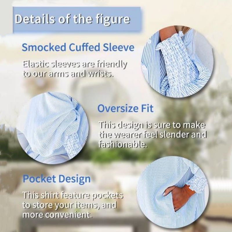 🔥Siste dag på salg 49 % RABATT🏆️Mellanglang smockad skjorte med stripete krage og overdimensjonerte nedbrettede ermer