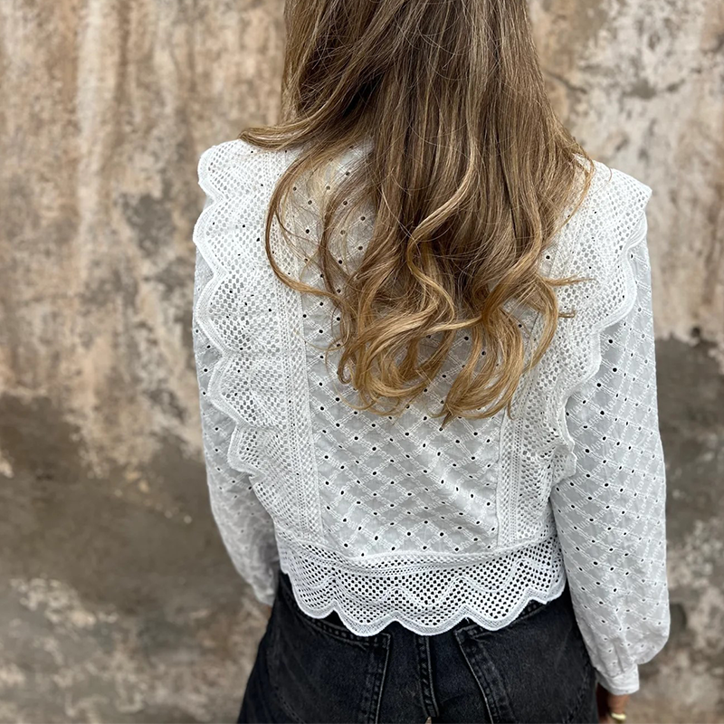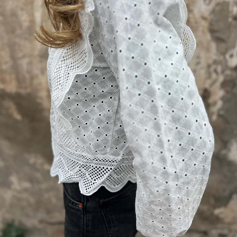 ELEGANTE BLONDER - Toppen er utsmykket med delikate blonder på flere steder, noe som tilfører en feminin mykhet og eleganse til denne uformelle hverdagstoppen.