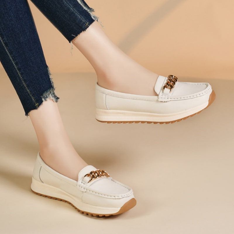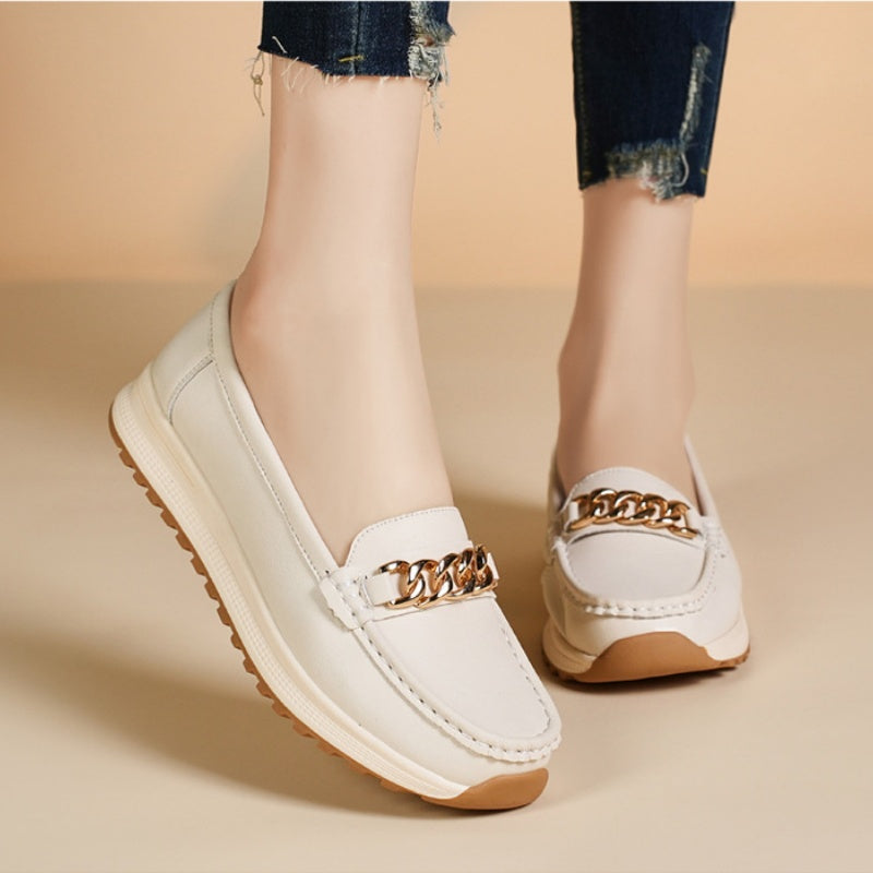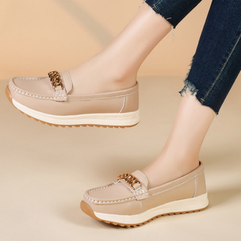 SLEEK SOLID COLOR WITH GOLD CHAIN DETAIL - Med en tidløs, ensfarget palett supplert med en subtil gullkjede, tilfører disse loaferne et snev av eleganse til ethvert antrekk.