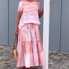 Elegant og uformell stil: Dette trendy 2-delte settet kombinerer komfort med eleganse og består av en flatterende topp med rund hals og et skjørt med høy midje. Den ombre fargegradienten og volangdetaljene skaper visuell interesse og gjør det perfekt til brunsj, stevnemøter eller uformelle utflukter - samtidig som det er helt i tråd med trenden.
