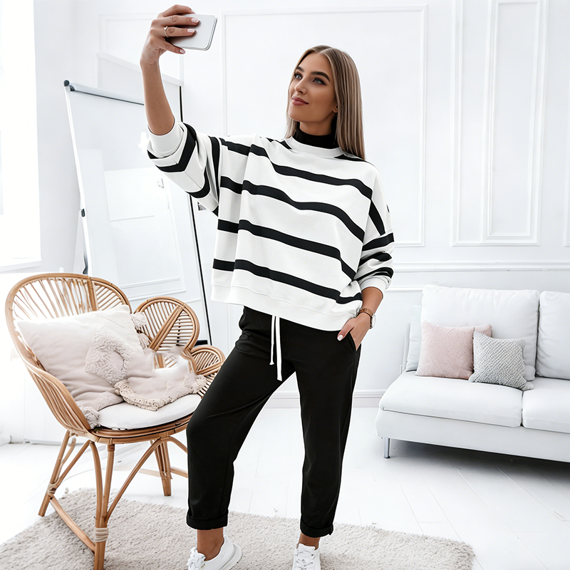 KLASSISK STRIPET MØNSTER - Tilfør et tidløst og elegant element til garderoben din. De dristige stripene på genseren skaper en visuelt tiltalende kontrast og forvandler et enkelt loungewear-sett til et moderne og trendy plagg.