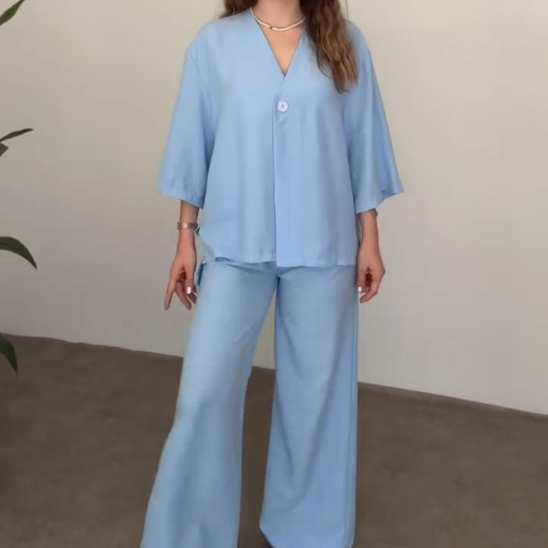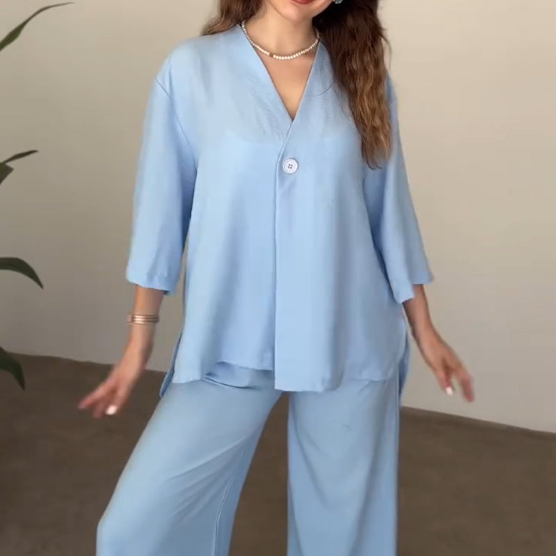 CHIC V-NECK DESIGN: Den elegante V-hals-toppen gir et subtilt snev av raffinement samtidig som den fremhever halsen din, noe som gjør dette settet stilig og egnet for forskjellige uformelle omgivelser.