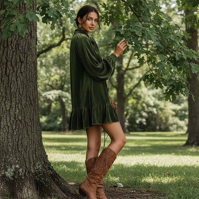 Kvinne kjole i fløyel med sløyfe i halsen og volanger i kanten